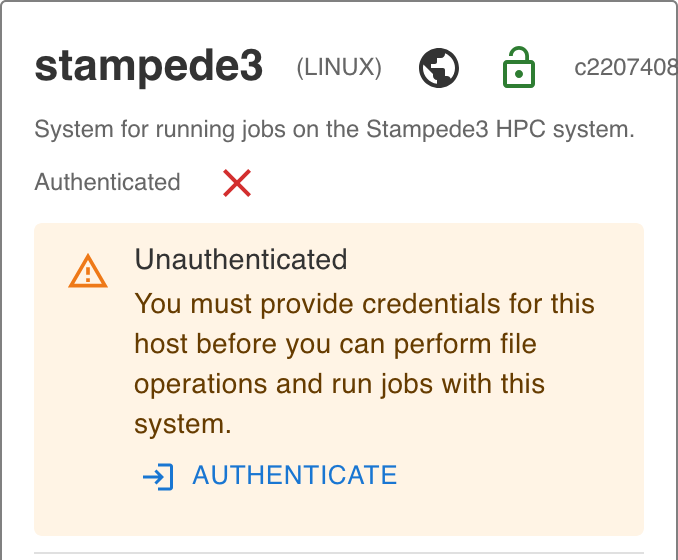 If this section displays a message that you are unauthenticated, then it will provide an "Authenticate" link that you can select which will display a form for you to enter your TACC account password.